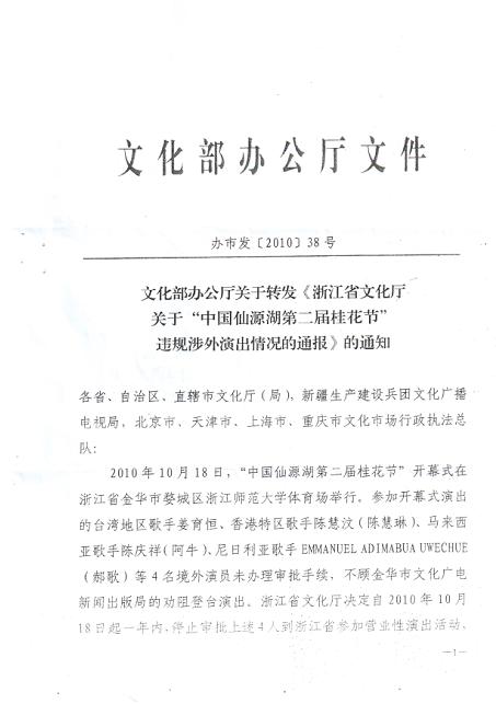 关于转发文化部办公厅转发<浙江省文化厅关于“中国仙源湖第二届桂花节”违规涉外演出情况的通报>